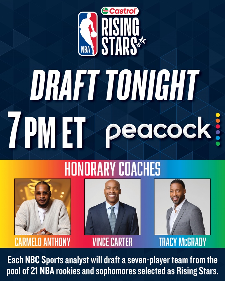 01月28日讯 NBA官方于今日08:00直播NBA全明星新秀赛选人仪式,由安东尼、麦迪、卡特三名教练从21名NBA一年级、二年级新秀中各选择7名队员。