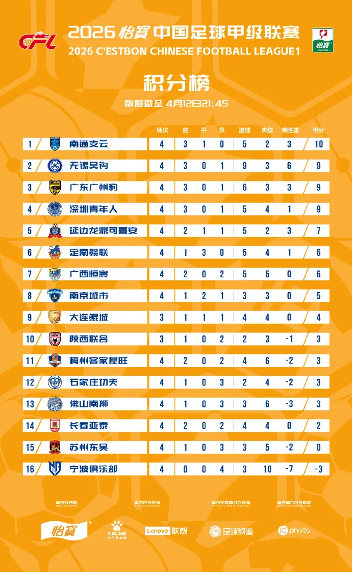 虎扑04月12日讯 2026中甲联赛第四轮比赛今日结束,本日赛况如下。